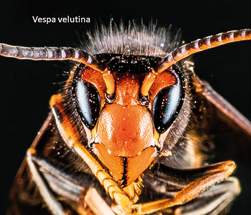 • El Avispón europeo en la parte superior del escudo facial por encima de los ojos muestra segmentos con tonalidades amarillo-rojizas, mientras que en la Avispa asiática son marrones oscuros o negros.